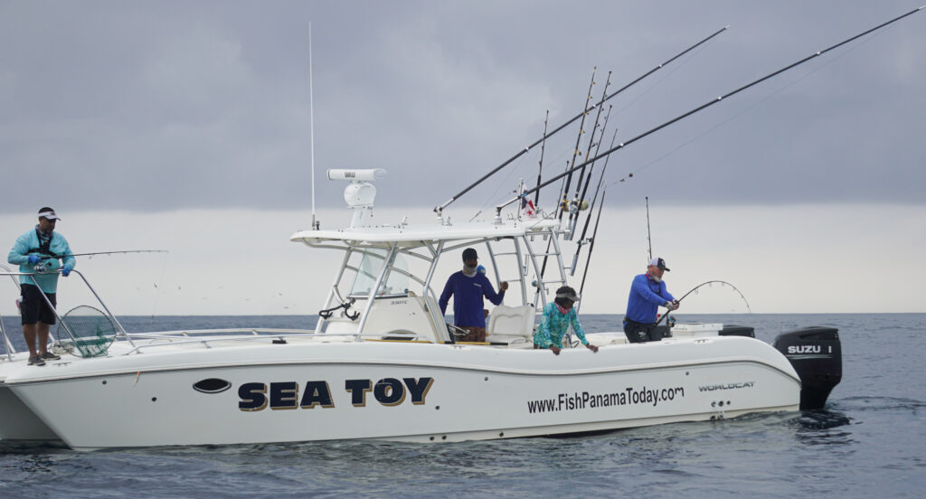 The Gulf of Chiriqui is one of the best places in the world to run and gun for yellowfin. This is one of the most exciting ways of fishing. It involves positioning the boat in front of moving schools of tuna and casting into them. We often find schools of tuna under flocks of birds or moving with pods of porpoises.