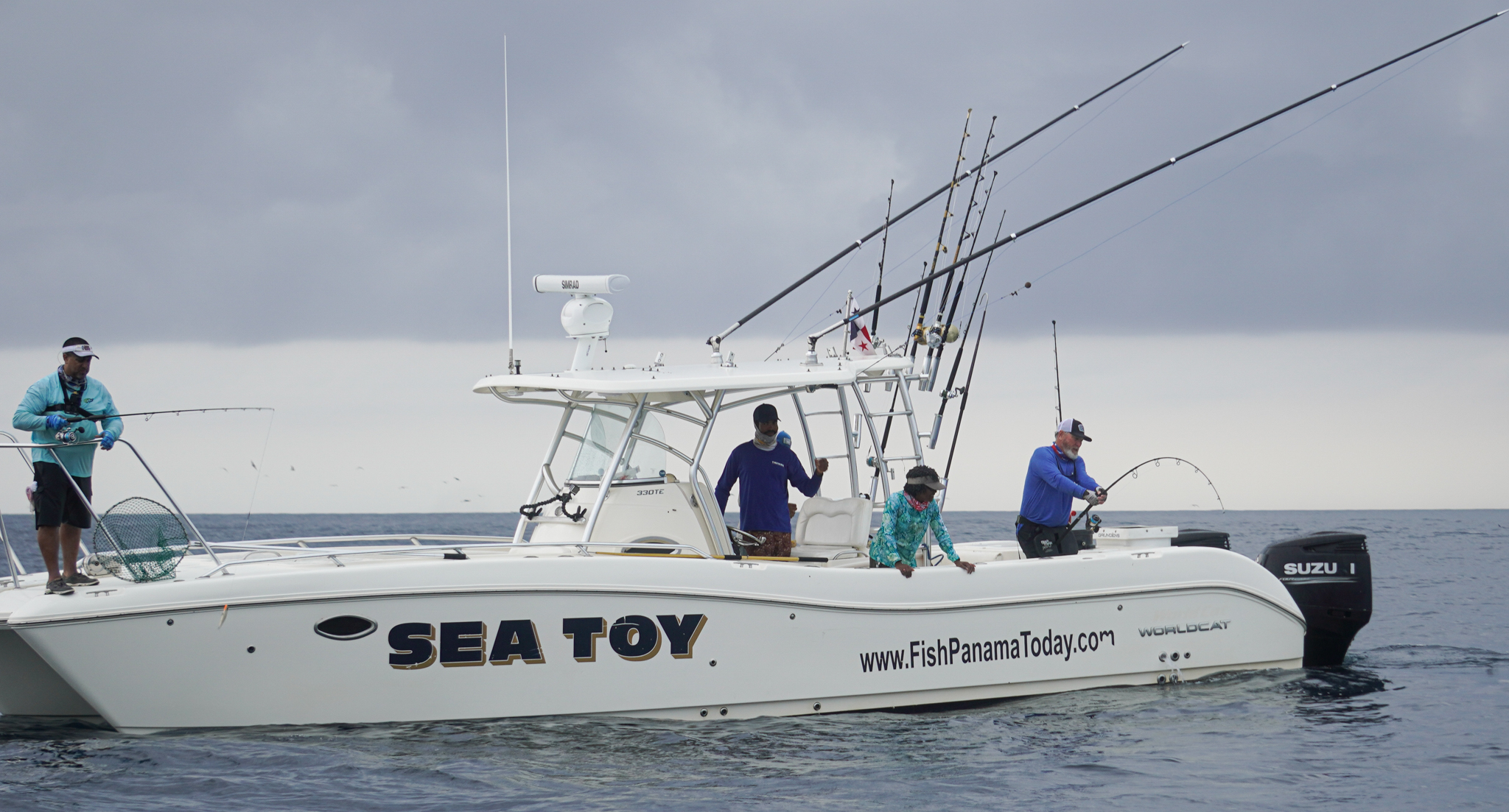 The Gulf of Chiriqui is one of the best places in the world to run and gun for yellowfin. This is one of the most exciting ways of fishing. It involves positioning the boat in front of moving schools of tuna and casting into them. We often find schools of tuna under flocks of birds or moving with pods of porpoises.