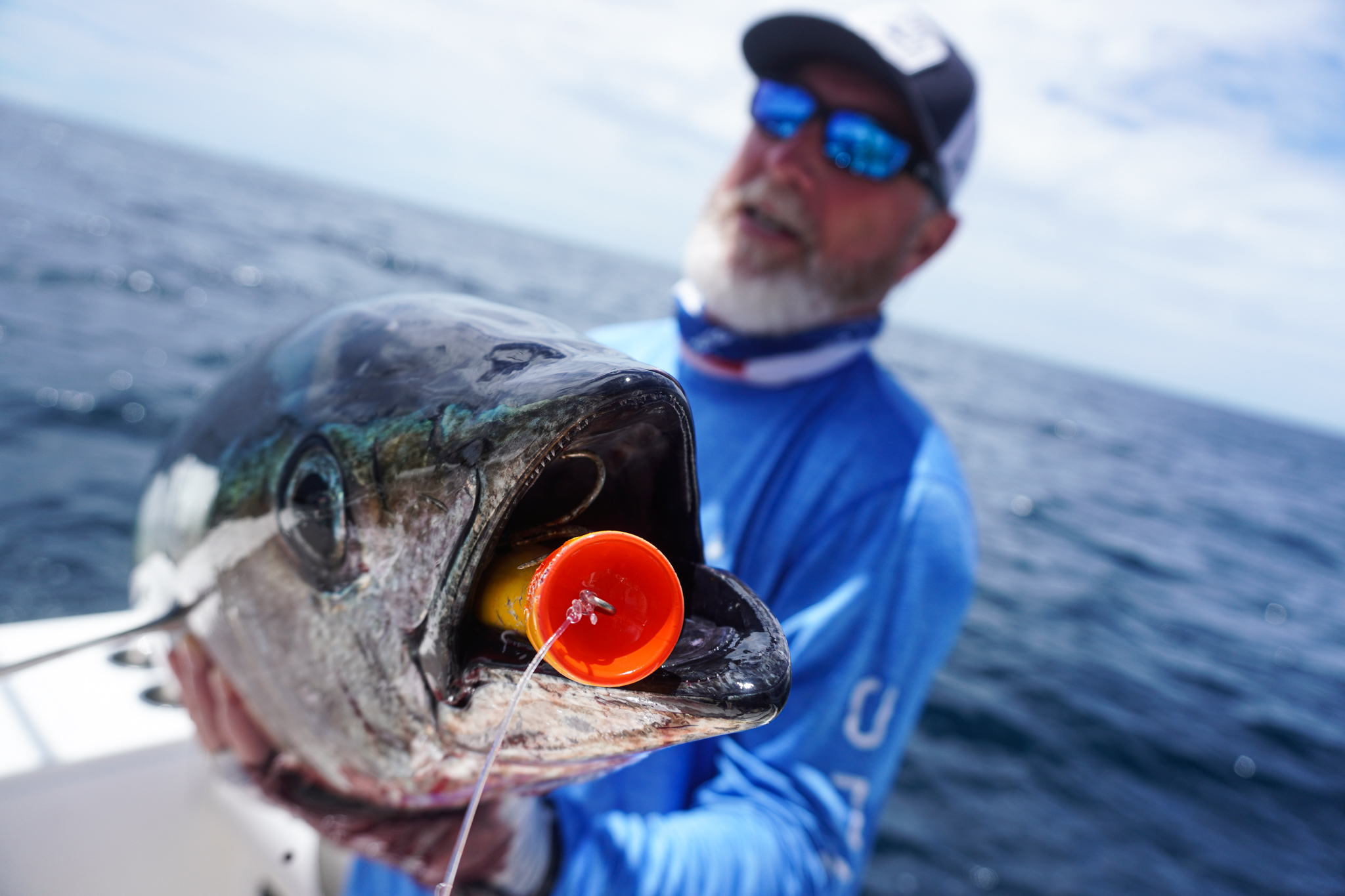 Beyond poppers, live baiting and fishing tuna frenzies, we have many ways to catch yellowfin. If we see tuna around and we’re trolling lures for marlin, we might add a cedar plug to the spread. Putting these on the shotgun and trolling it behind the remainder of the spread is a great way to pick up a yellowfin or a bonus sailfish or dorado.