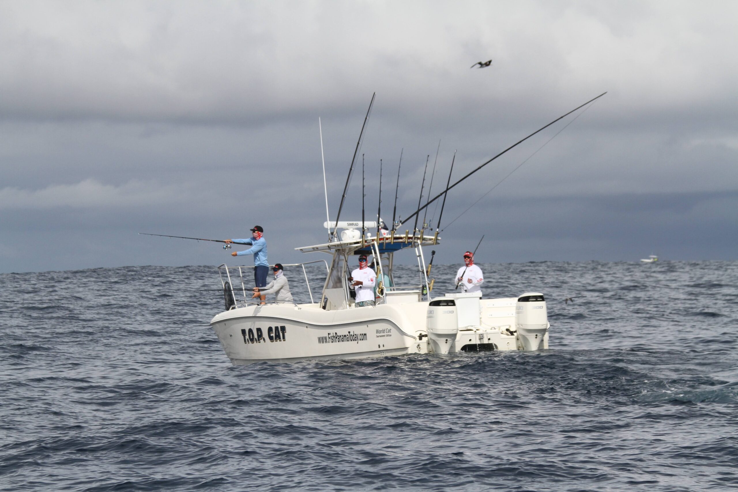 Now let’s talk about your deep sea fishing experience at Sport Fish Panama Island lodge. Breakfast starts at 6:00 am and expect to be aboard one of our World Cats at 7:00 for offshore departure. Being equipped with Simrad open array radar gives each of our vessels an 8-mile swath competitive advantage in locating birds on the run to Hannibal Bank or Isla Montuosa. If we find birds, there will usually be dolphins, and beneath them the tuna. Now the fun begins! High speed runs to get in front of the feeding dolphins and pitch a live bait to hopefully feeding tuna. We carry blue runners in our live wells in anticipation of finding either tuna or mahi-mahi while running. On other occasions finding the birds will locate a “tuna boil” into which we pitch live baits for instant and non-stop action.