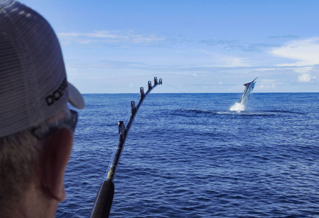 When you’re live-baiting and a reel goes off, it’s not uncommon for the jumping fish to be a blue marlin instead of a black. For the purposes of hooking and fighting them, the process unfolds in the same manner.