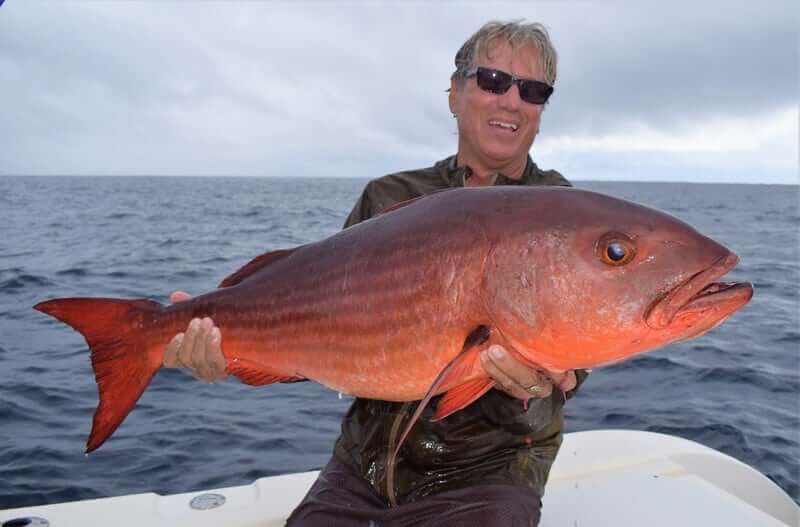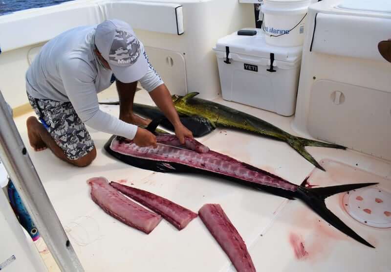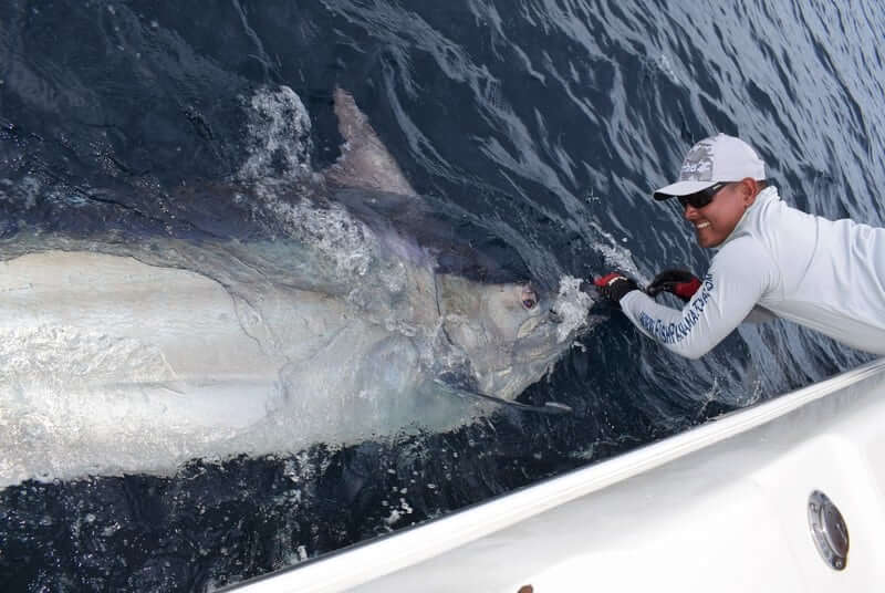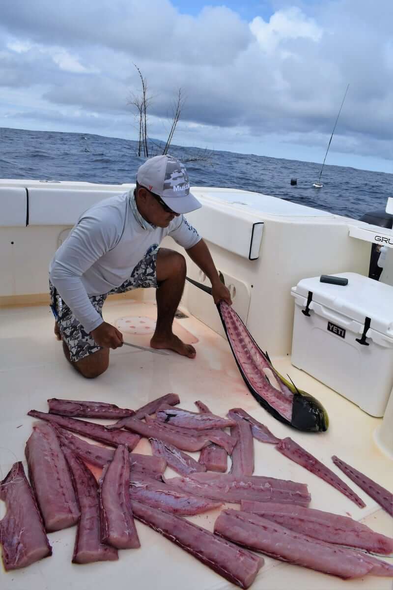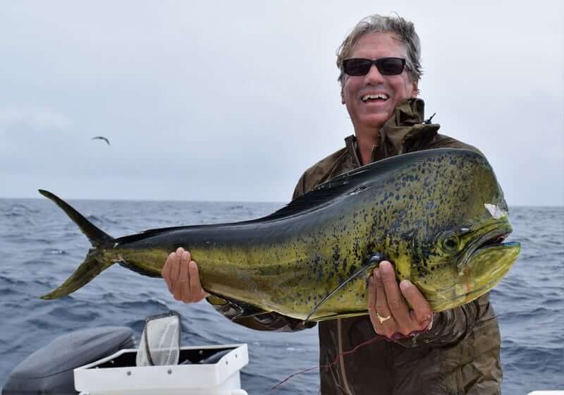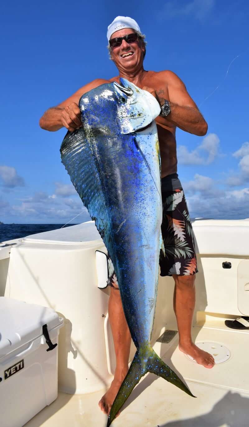 One awesome day we came across a monster Bamboo tree with a commercial boat’s radio beacon attached to it…they must have been using it way offshore near Galapagos as a flaoting FAD to attract bait and Tunas (we find FADS like this all the time here)…and it happened to drift right up into our area. As we pull up on the tree we can see a bunch of big Dorados and bait all swimming around. We catch 3 nice Bulls and a cow and then decide to keep on going. We run out to Isla Montuosa and Jay catches and releases his first Black Marlin! About 400 pound beauty!! Then on the way home…I pick up the mark and find the tree again using our Simrad Halo 4 radar. We run up on the tree and Mike and Jay both cast artificials at the Dorados we can see still around the tree…..BOOM!!….Mike hooks up a Bull Dorado on the Yo-Zuri Mag Darter….and then….BAM!!….Jay hooks and even bigger Bull on the Yo-Zuri Bul Pop popper! Double header!!! Definitely a memorable day!!!