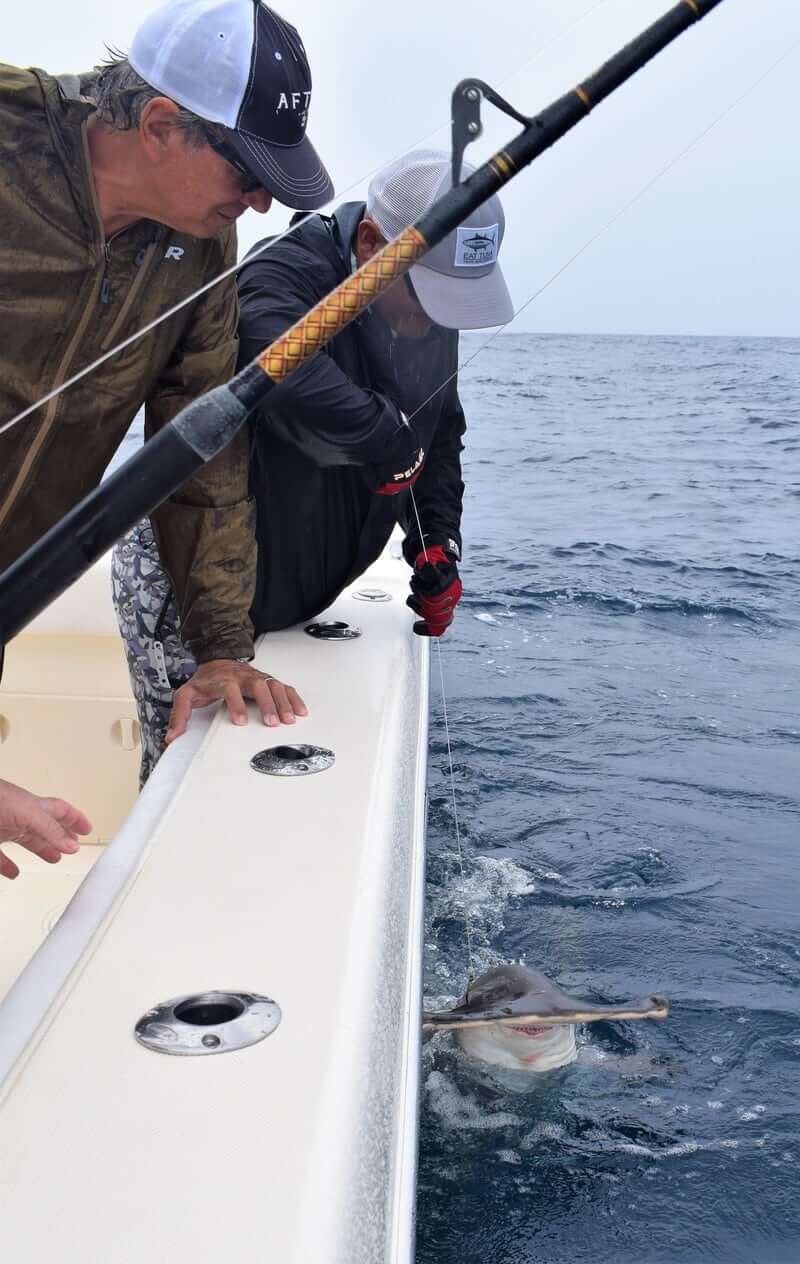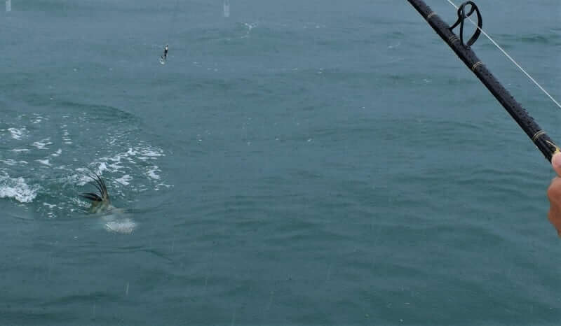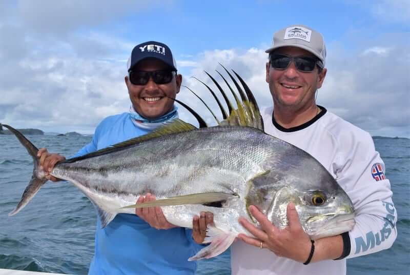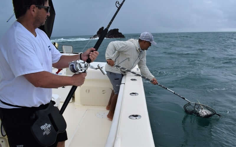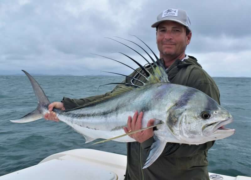 Another memorable day from that trip was the rainiest of them all. It was actually raining and blowing so the seas were not good to run offshore. We decided to fish around the island and near the lodge. We were lucky enough to find a spot where the Roosterfish were chomping at the bit and we went 6 for 11 all in the same spot!! It was pretty awesome to see as we were literally passing by the exact same spot with our live baits and big Roosters were blowing up chasing our baits as we pegged Rooster after Rooster! And all nice sized ones…all over 25 pounds! Thanks so much to Jay and Mike for the business!!!
