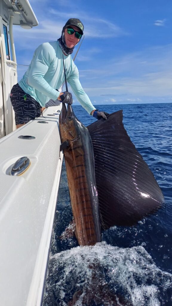 Catching sailfish is great. They jump often. Sails are fond of windshield wiping, putting their head and shoulders out of the water, waving their bills back and forth.
