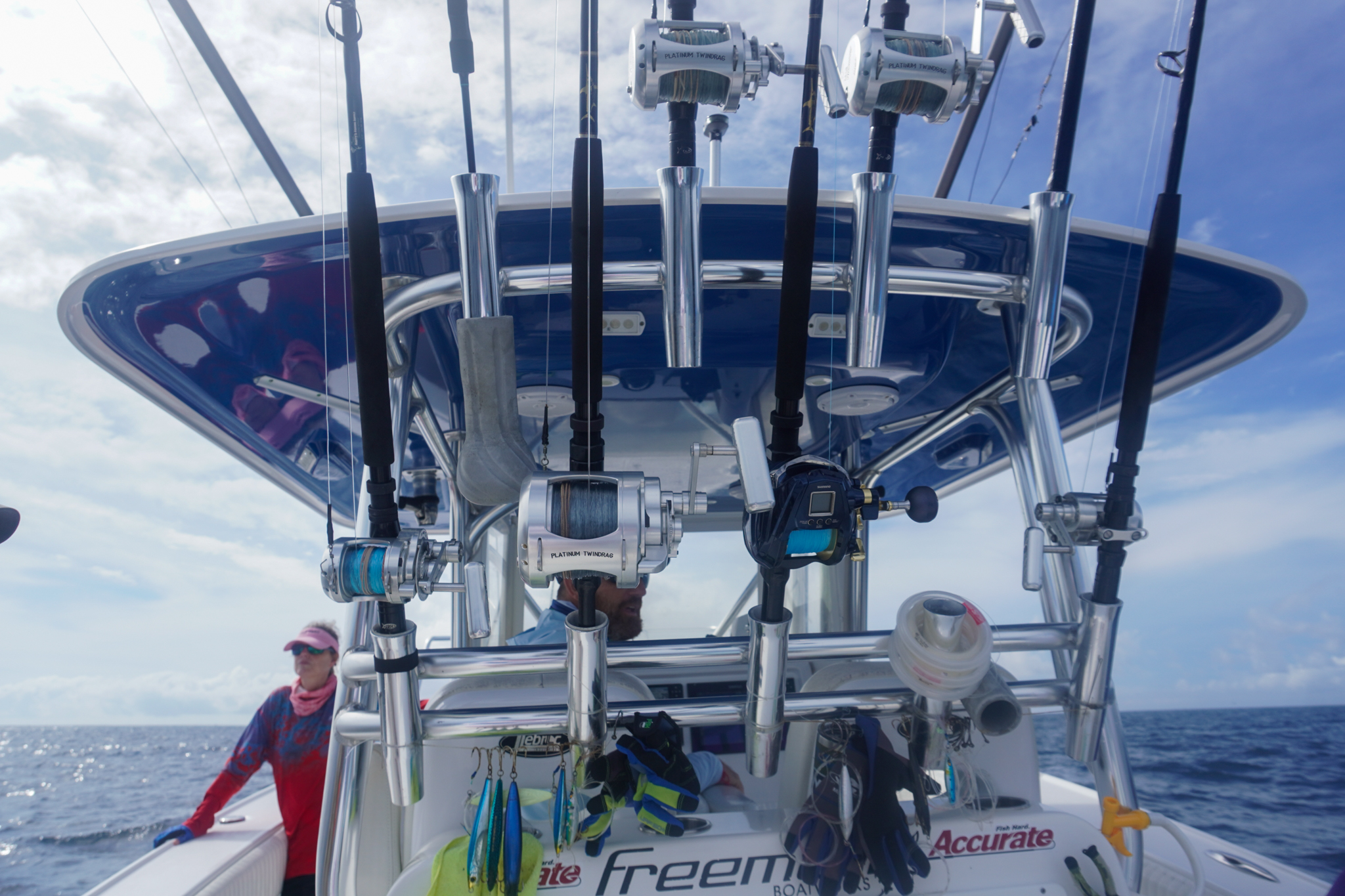 We toll these baits 40 or 50 yards behind the boat. Our crews use conventional setups—Accurate reels on Blackfin rods. We run the lines through the outriggers, with the reels near freespool. The first indication of a roosterfish bite might be the clicker squealing, it might be the bait thumping in a frenzy.